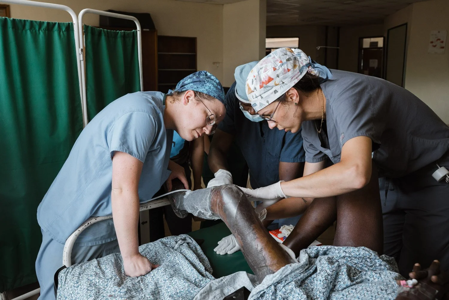 Dr. Celeste and visiting trauma surgeon PA, Brittany, prepare and bandage a patient’s wound before beginning wound vac therapy.