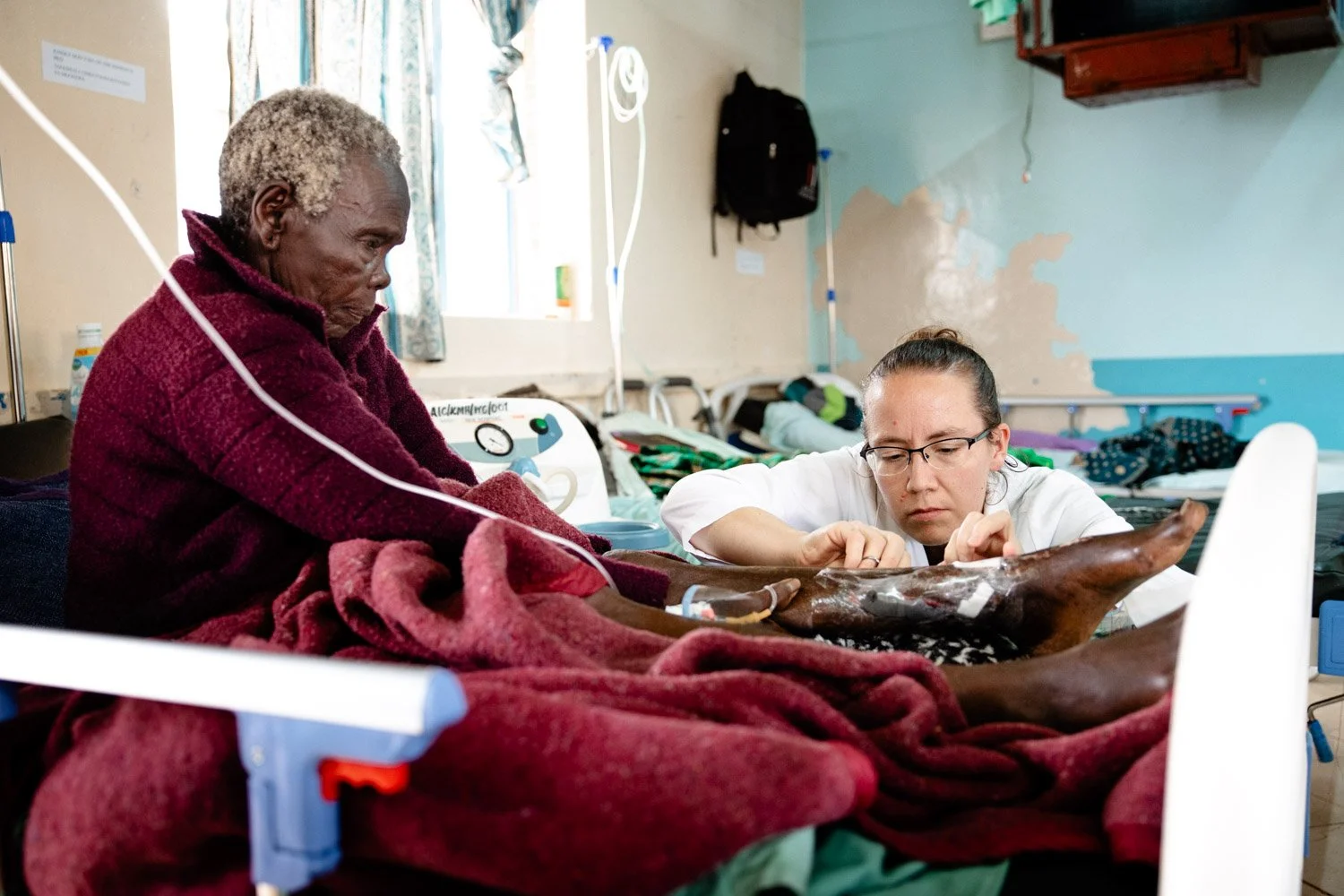 Dr. Celeste carefully changes a patient’s dressing in the post-operative ward.
