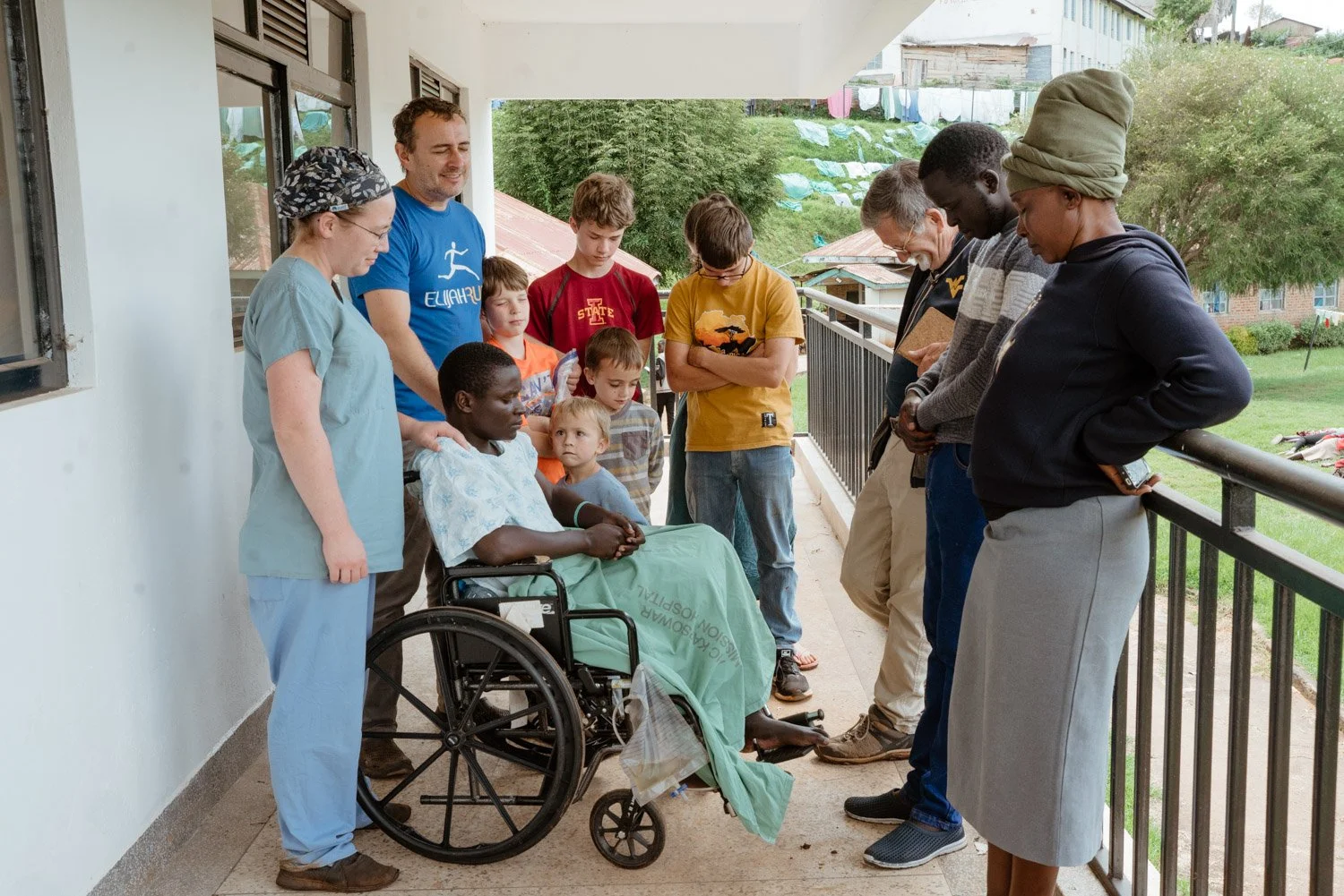 Our team gathering with Isaac and his mom to pray over him as he prepares to go home.